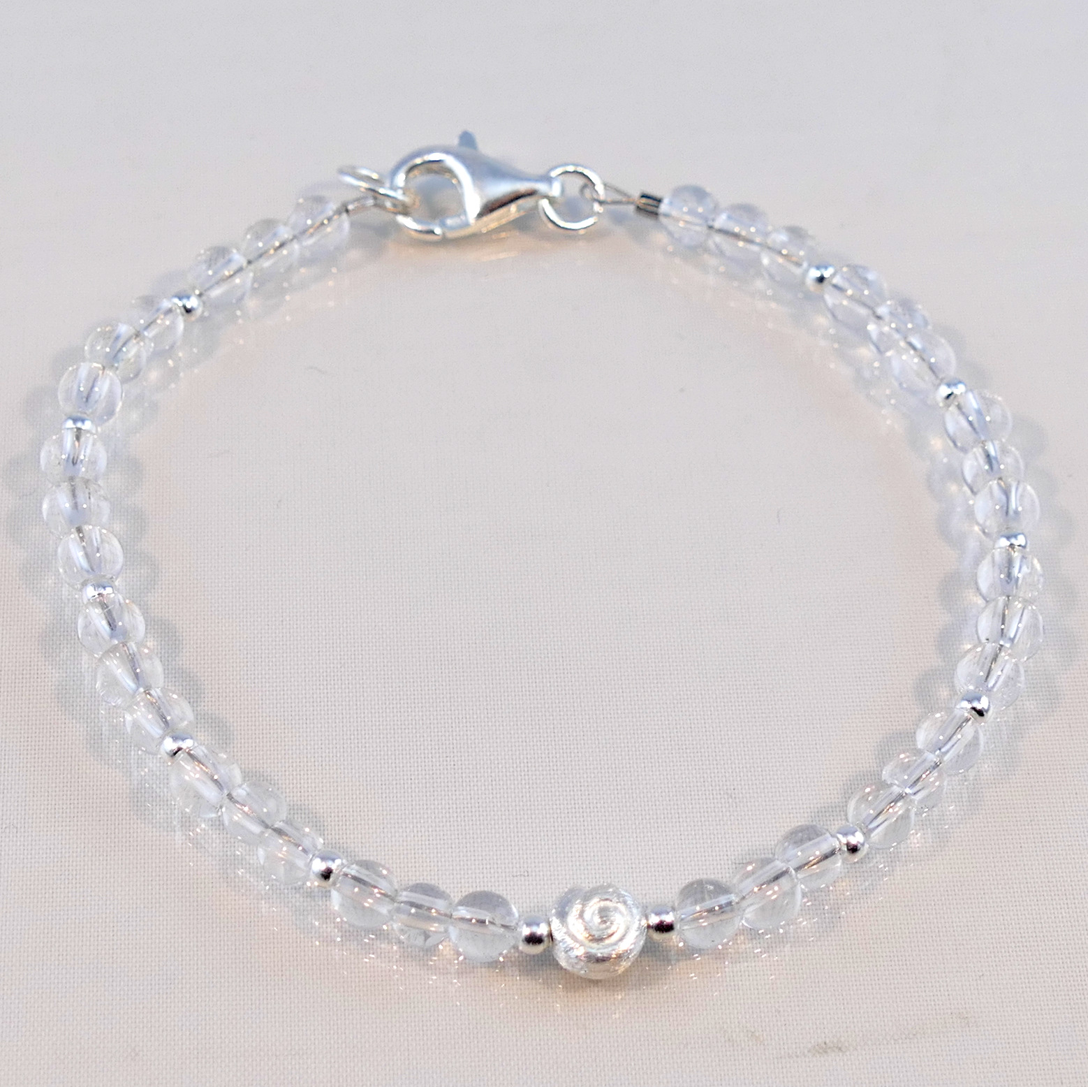 Sensationelles Armband aus Bergkristallkugeln mit einer Silberschnecke und Silberelementen. Die Kugeln haben einen Durchmesser von 8 mm, der Karabiner ist ebenfalls aus Silber. Das Armband hat eine Länge von ca. 19 cm.